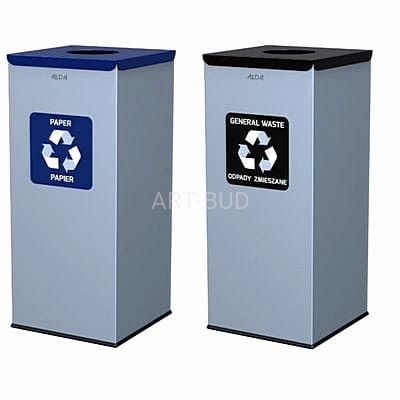 Nowoczesny kosz stalowy do segregacji odpadów o podstawie kwadratowej. Wykonany ze stali zwykłej z kolorową pokrywą. Pojemnik kosza ma naklejkę z informacją o odpadach.