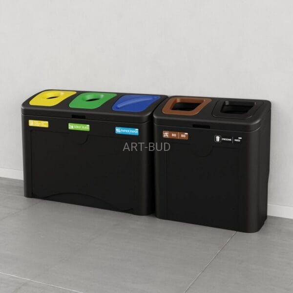 TUDEKS Large MINIMAL 3 x 50 L to stacja o minimalistycznym designie, przeznaczona do selektywnej zbiórki pięciu frakcji odpadów. Dostępność w dwóch wariantach kolorystycznych – jasno szarym oraz czarnym sprawia, że wpasuje się w każdą przestrzeń. Stacja TUDEKS MINIMAL to propozycja dla biur, urzędów, uczelni oraz wszystkich miejsc użytku publicznego.