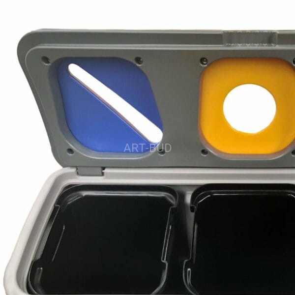 - Pojemników wewnętrznych, każdy o pojemności 50 litrów. Wiadra mają grube, solidne ściany, wykonane z polietylenu. Każdy z nich posiada mocne uchwyty, dzięki którym z łatwością wyjmiemy pojemnik i wyrzucimy odpad. Pojemniki są łatwe w utrzymaniu w czystości.