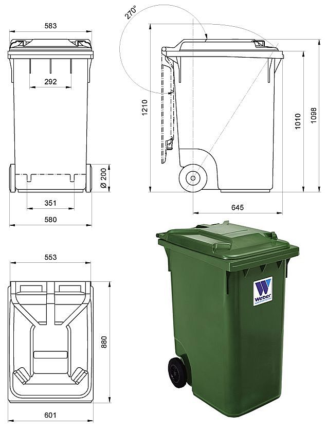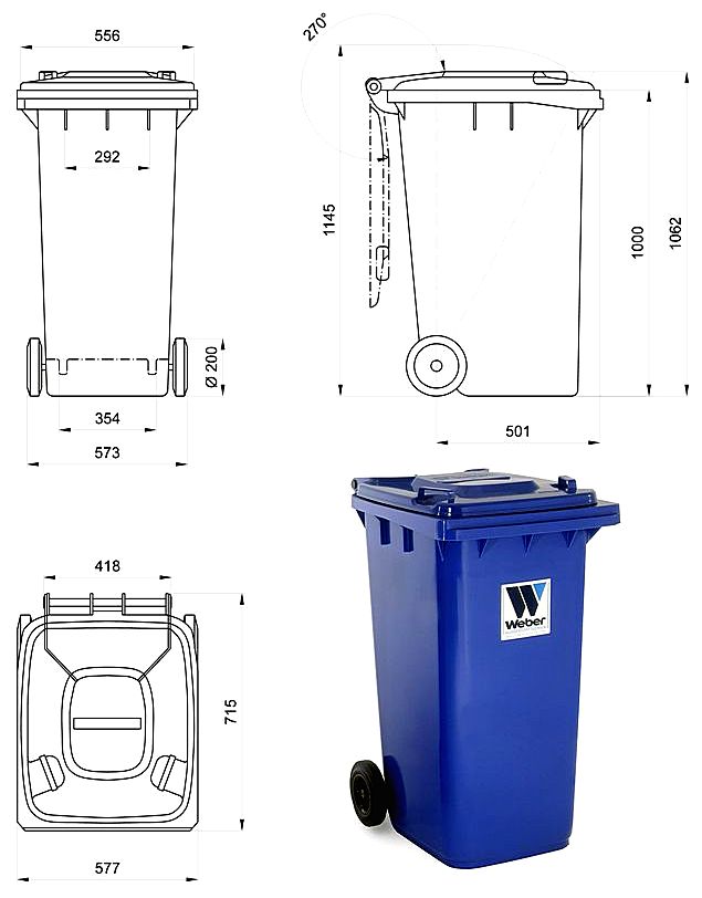 Większe 140 i 240-litrowe pojemniki mogą być wyposażone w koła Ø 250 x 50 mm, 360-litrowe pojemniki w koła Ø 300 x 50 mm .Pojemniki są zaprojektowane tak, by pomieścić nośniki danych (dane, informacje) oraz dostępne oznakowanie: wytłoczenie, wytłaczanie na gorąco, naklejki.