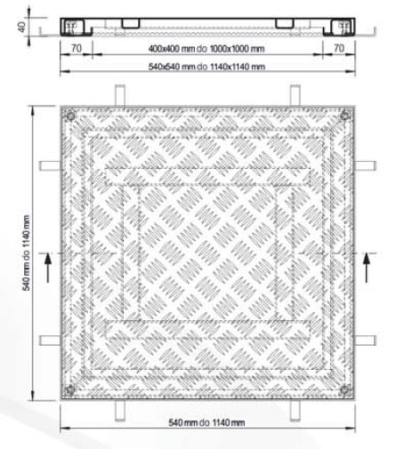 Pokrywa włazu System PRO-RI wykonana została z wysokiej jakości antypoślizgowej, aluminiowej blachy ryflowanej 3/5 mm. Rama pokrywy wykonana została z aluminiowego kątownika 2 mm. Wysokość całej konstrukcji wynosi 40 mm. Pokrywa przeznaczona jest do ruchu pieszego.