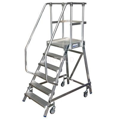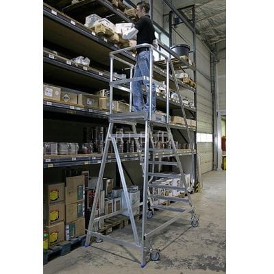 Pomost jezdny z jednostronnym wejściem powiększona listwa przypodłogowa i wydłużonymi barierkami(wg. PN EN 131-7). Pomosty jezdne to niezbędne wyposażenie każdego magazynu hali lub fabryki. Zapewniają wygodny i bezpieczny dostęp do wszelkich towarów wysokiego składowania. Wygodne stopnie, bezpieczny podest o wym. 60x70cm oraz wysoka poręcz (1 m) zapewniają komfortowe użytkowanie. Pomost dostępny jest w sześciu konfiguracjach od 3 do 8 stopni, co daje możliwość pracy w przedziale od 2,8 – 3,9 m. Dodatkowe rolki samoblokujące pozwalają na swobodne przemieszczanie. Jego dopuszczalne obciążenie wynosi 150 kg i spełnia normy EN 131, BGI 637, BGI 694 i BGV-D 36.