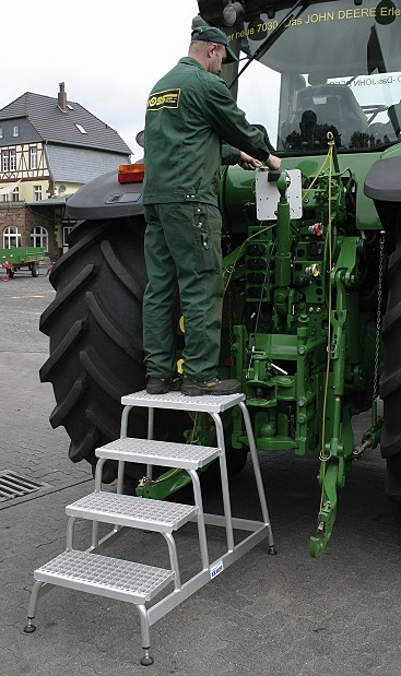 Pomost montażowy Stabilo ze stopniami z kraty przeznaczony jest do miejsc pracy w których stosuje się różne środki poślizgowe lub smary np. warsztaty samochodowe.