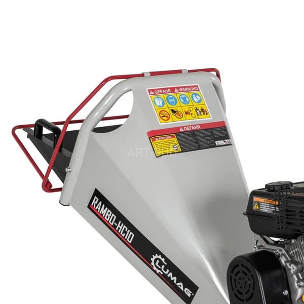 Rębak RAMBO-HC10 marki Lumag Germany z mocnym i wydajnym silnikiem 5,5 KM napędzanym mechanizm tnący za pośrednictwem dwóch pasków klinowych pozwala na rozdrabnianie gałęzi o grubości do 100 mm. Rębak wyposażony jest w system noży szybkotnących radzących sobie z rozdrabnianiem każdego rodzaju drewna z wycinek ogrodowych oraz innych materiałów pochodnych. Idealny do pracy w ogrodzie, sadzie itp. Duże opony ułatwiają transport maszyny. Wysoko usytułowany zrzut ciętego materiału umożliwia podstawienie taczki do bezpośredniego odbioru materiału. Duży i długi lej zapewnia łatwą i bezpieczną pracę.