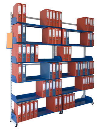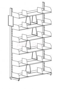 Regały biblioteczne – jednostronne i dwustronne, wyposażone w przegródki i wsporniki do książek, prasy i innych dokumentów z kartą informacyjną na każdym module. Szkielet regałów wykonany z blachy stalowej gr. 2,5 mm, profilu zamkniętego. Regały posiadają półki z blachy stalowej gr. 0,8 mm, przestawne co 50 mm. Pozostałe elementy wykonane z blachy stalowej gr. 0,6-1,5 mm. Regały do samodzielnego montażu. Regał malowany proszkowo. Regały malowane są w 13 kolorach standardowych według poniżej palety RAL. Regały mają wysunięte półki, zaczepiane na słupkach konstrukcyjnych, do łatwego montażu, bez użycia śrub. W bardzo prosty sposób można zmieniać rozstaw półek lub je demontować. Rozstaw otworów do mocowania półek wynosi 30 mm.
