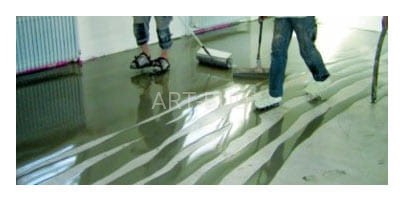 Duże powierzchnie podzielić na działki robocze przy pomocy samoprzylepnej taśmy z gąbki weber.floor 4965. Zaprawę weber.floor 4010 wylewać na podłoże pasmami o szerokości 30-40 cm. Kolejne porcje zaprawy przygotowywać i wylewać tak szybko, aby mogły połączyć się, gdy są jeszcze w stanie płynnym. Po wylaniu masę rozprowadzić pacą zębatą lub wałkiem kolczastym. Zaprawę układać bez przerw, aż do pokrycia całej powierzchni działki.