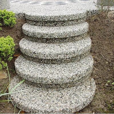 Bardzo efektowne STOPNIE SCHODOWE OKRĄGŁE z betonu płukanego z dodatkiem kruszyw dekoracyjnych.Składające się z dwóch elementów (stopnica i pod stopień) o średnicy 100 cm i grubości 8 cm każdy, co daje wysokość dla jednego stopnia - 16 cm. Tworzą oryginalną kompozycję wizualną w każdym otoczeniu, np. ogrodów w zastosowaniu przy skarpach. Bogata kolorystyka w efektowny sposób pozwala na atrakcyjne dopełnienie całości otoczenia. Schody tworzą oryginalną kompozycję wizualną w każdym otoczeniu, np. ogrodów w zastosowaniu przy skarpach.