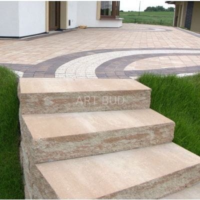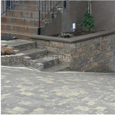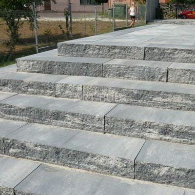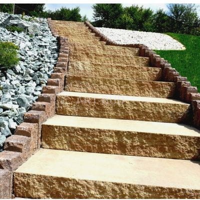 Krawędź czołową ma fakturę łamaną, imitującą naturalny kamień, natomiast górna powierzchnia bloków schodowych przeznaczona do chodzenia jest zupełnie równa i gładka, zapewniając bezpieczeństwo i zachowanie czystości.