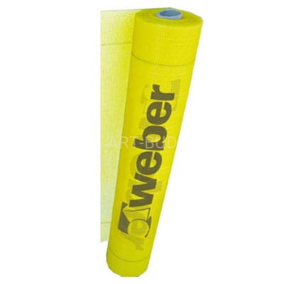 Siatka z włókna szklanego, w kolorze żółtym przeznaczona do stosowania, jako materiał zbrojący w złożonych systemach izolacji ścian zewnętrznych budynków Weber o gramaturze 150 ±5 g/m².