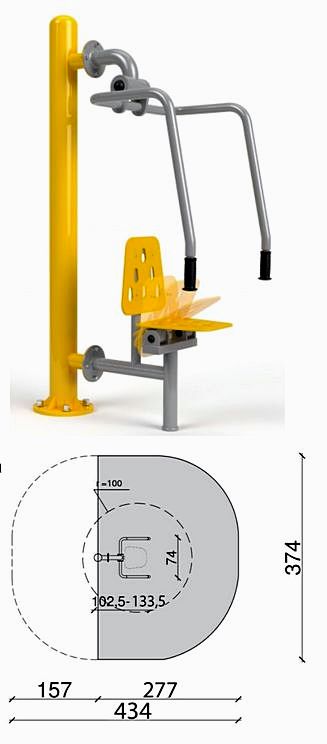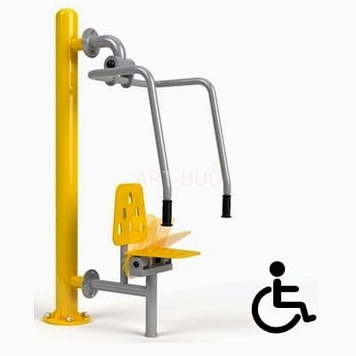 Wyciskanie siedząc integracyjna siłownia disabled + słup, urządzenie siłowni zewnętrznej dwufunkcyjne: Dzięki zastosowaniu mechanizmu składanego siedziska, urządzenie przystosowane jest również dla osób poruszających się na wózku inwalidzkim. Ćwiczenia wzmacniają mięśnie klatki piersiowej, obręczy barkowej oraz kończyn górnych. Proponujemy element siłowni integracyjnej do ćwiczeń dla niepełnosprawnych poruszających się na wózkach inwalidzkich, który pozwala wzmacniać różne części ciała i pozytywnie wpływa na sprawność fizyczną. W naszej ofercie dla siłowni integracyjnych znajdują się przyrządy, które pozwalają wzmacniać ramiona, nogi, mięśnie klatki piersiowej, pleców i wiele innych. Dodatkowo nasze urządzenia do ćwiczeń dla niepełnosprawnych poprawiają wydolność krążeniowo-oddechową.