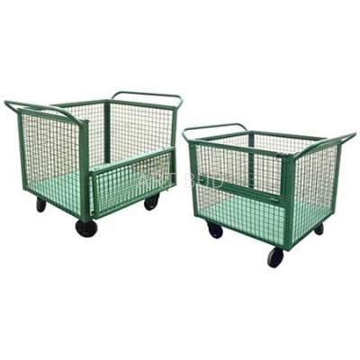 Konstrukcja nośna z kątowników i blachy stalowej, ściany boczne i dno z siatki ocynkowanej karbowanej fi 4,0-4,5 mm, o oczku 50x100 mm lub 50x50 mm, jedna ściana boczna otwierana do połowy, wyposażone w kółka obrotowe fi 200 mm metalowo-gumowe (oponki na pełnej gumie), malowany farbami proszkowymi – kolory do uzgodnienia.