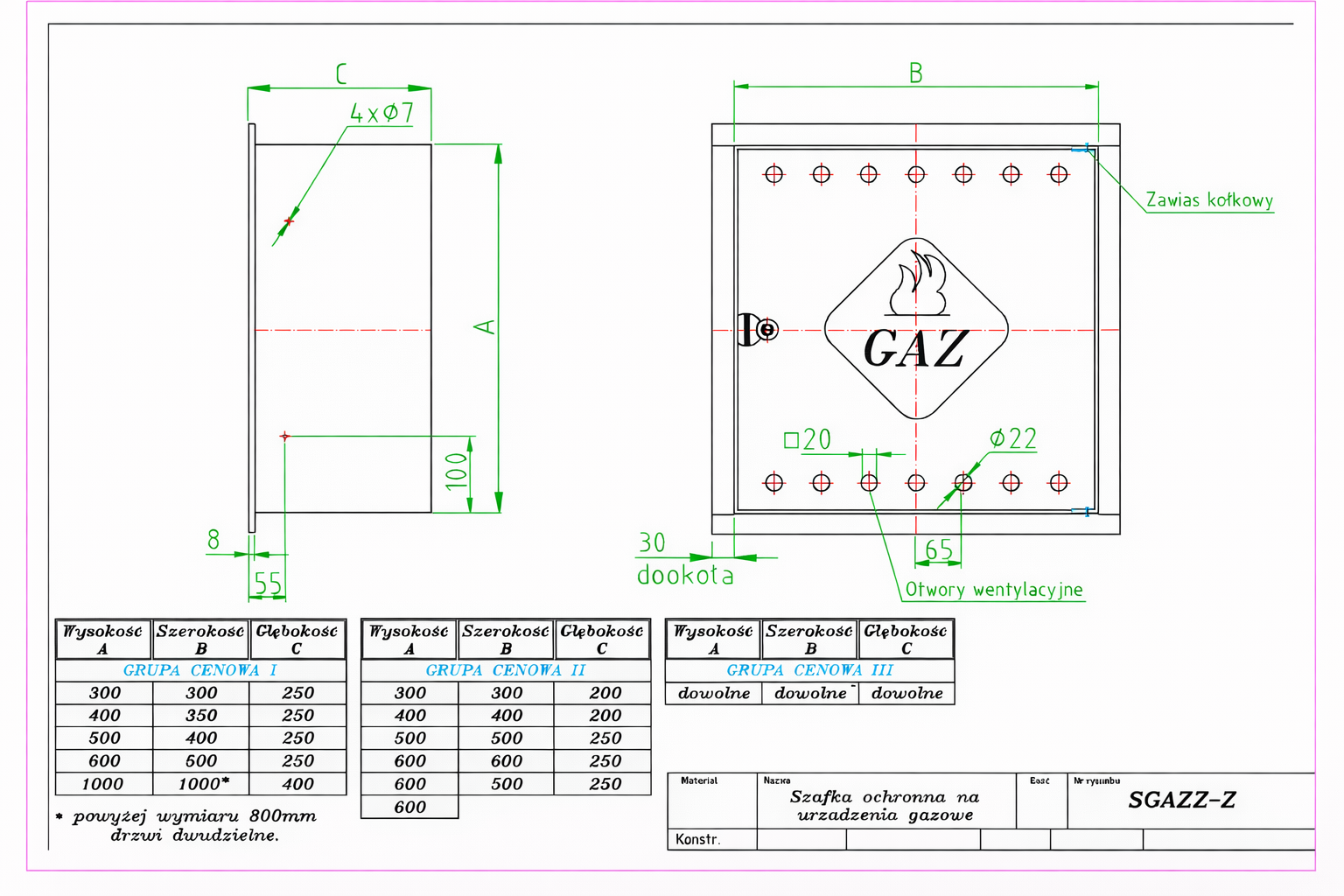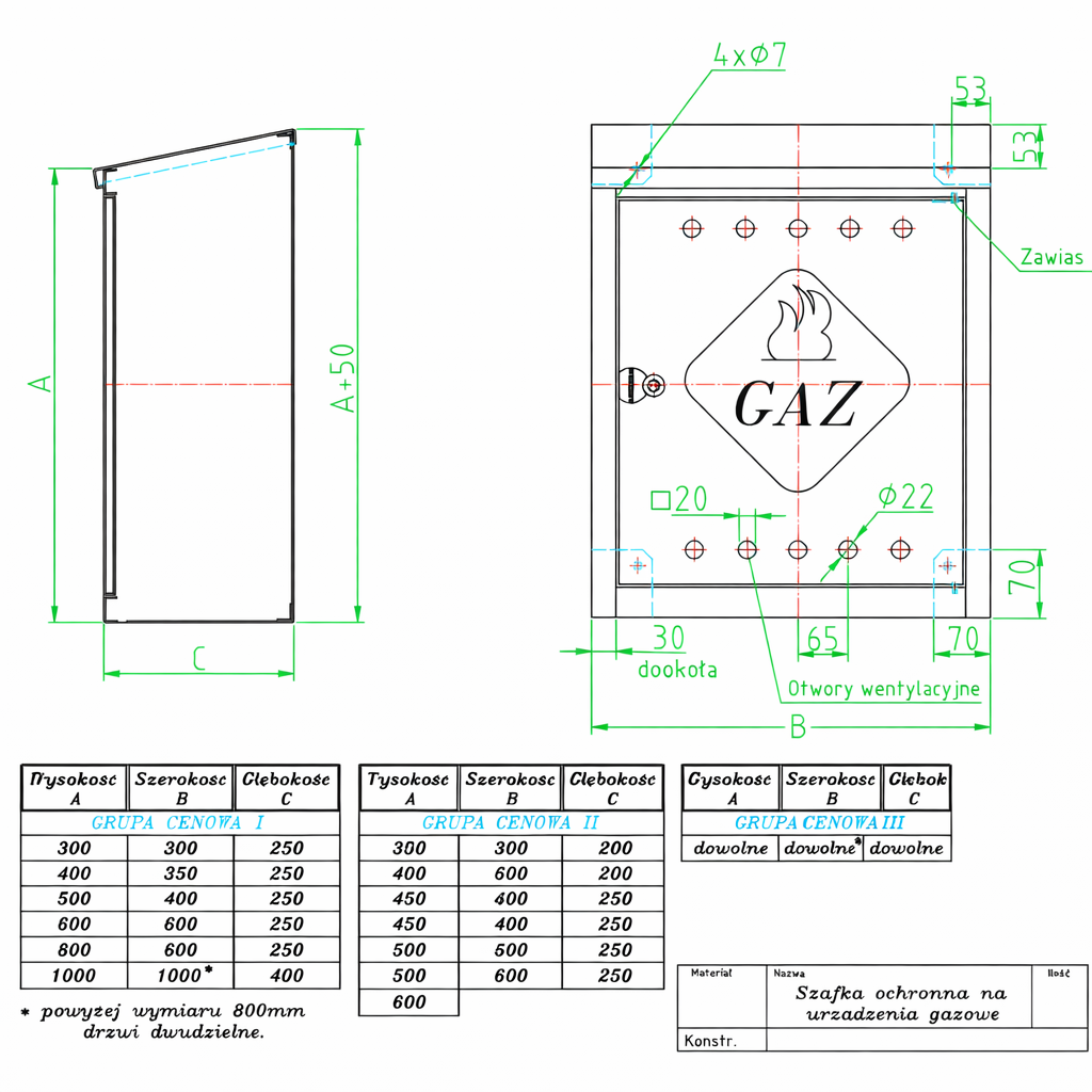 Przedstawiona cena dotyczy szafki GAZ Z  300/300/250  wersja podstawowa, bez pleców i spodu, za dołożenie każdej ścianki cena wzrasta +50%.