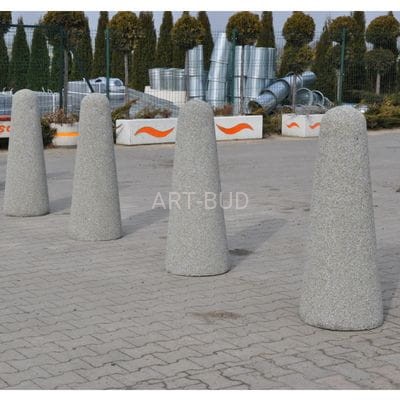 Klasyczny stabilny słupek betonowy parkingowy w kształcie stożka o fakturze betonu płukanego z możliwością zamocowania w gruncie, oraz połączenia szeregu słupków łańcuchami.