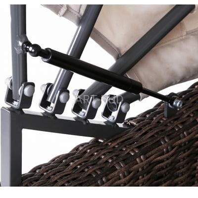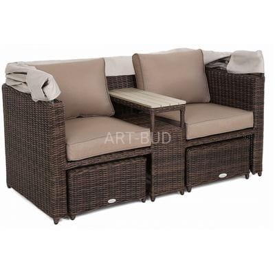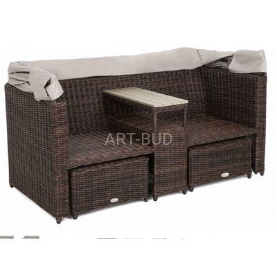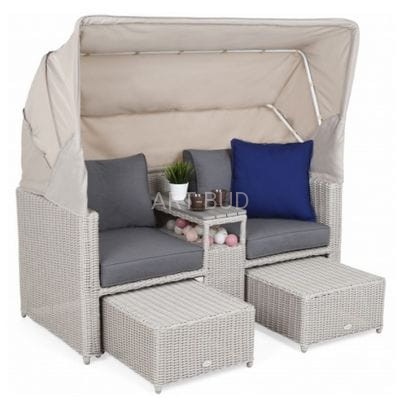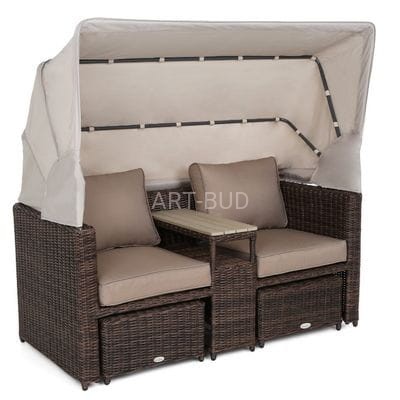 Oryginalny i ciekawy design, to cecha, jaką charakteryzuje się sofa ogrodowa z baldachimem Michigan. Mebel jest wykonany z solidnych, a zarazem lekkich materiałów: stelaż stanowią profile aluminiowe malowane proszkowo, a pokrycie - elastyczny technorattan. Dzięki nim sofa ogrodowa może być użytkowana na zewnątrz od pierwszych wiosennych dni, aż do późnej jesieni - nie straszne jej promieniowanie UV, zmiany temperatury i wilgoć. Doskonale wypełni przestrzeń ogrodu i idealnie sprawdzi się jako mebel tarasowy czy balkonowy. Sofa po rozłożeniu daszka przybiera kształt kosza plażowego - zapewnia intymność i w razie potrzeby chroni przed nadmiernym nasłonecznieniem. Wydzielone przy pomocy wbudowanej półki miejsca zapewniają pełny komfort: tworzą się oddzielne fotele z podręcznym stoliczkiem. Aby korzystającym było jeszcze wygodniej, do dyspozycji są podnóżki pełniące również rolę puf. Całości dopełniają grube poduchy z obiciami z miłego w dotyku materiału zapinanymi na suwak - można je więc bez problemu utrzymywać w należytej czystości.