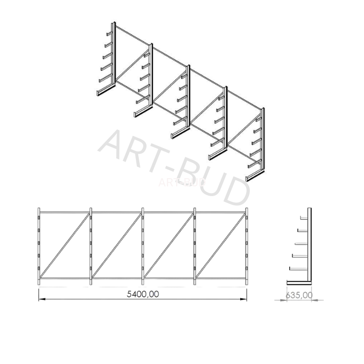 Spawany regał wspornikowy choinkowy jednostronny 2000x5400x635mm