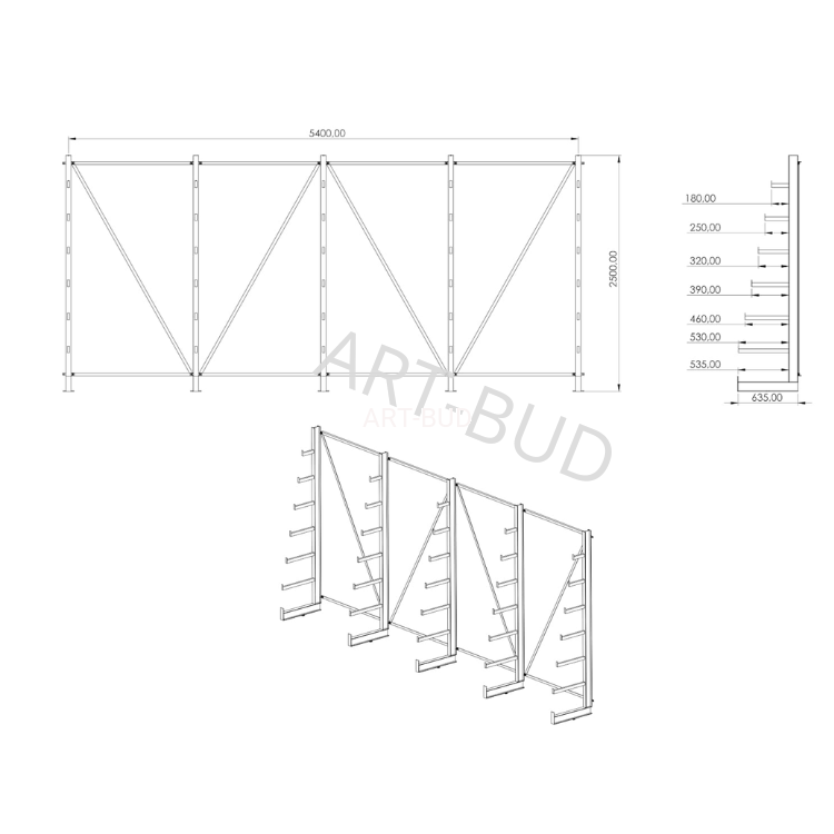 Spawany regał wspornikowy - choinkowy, jednostronny, 2500x5400x635mm