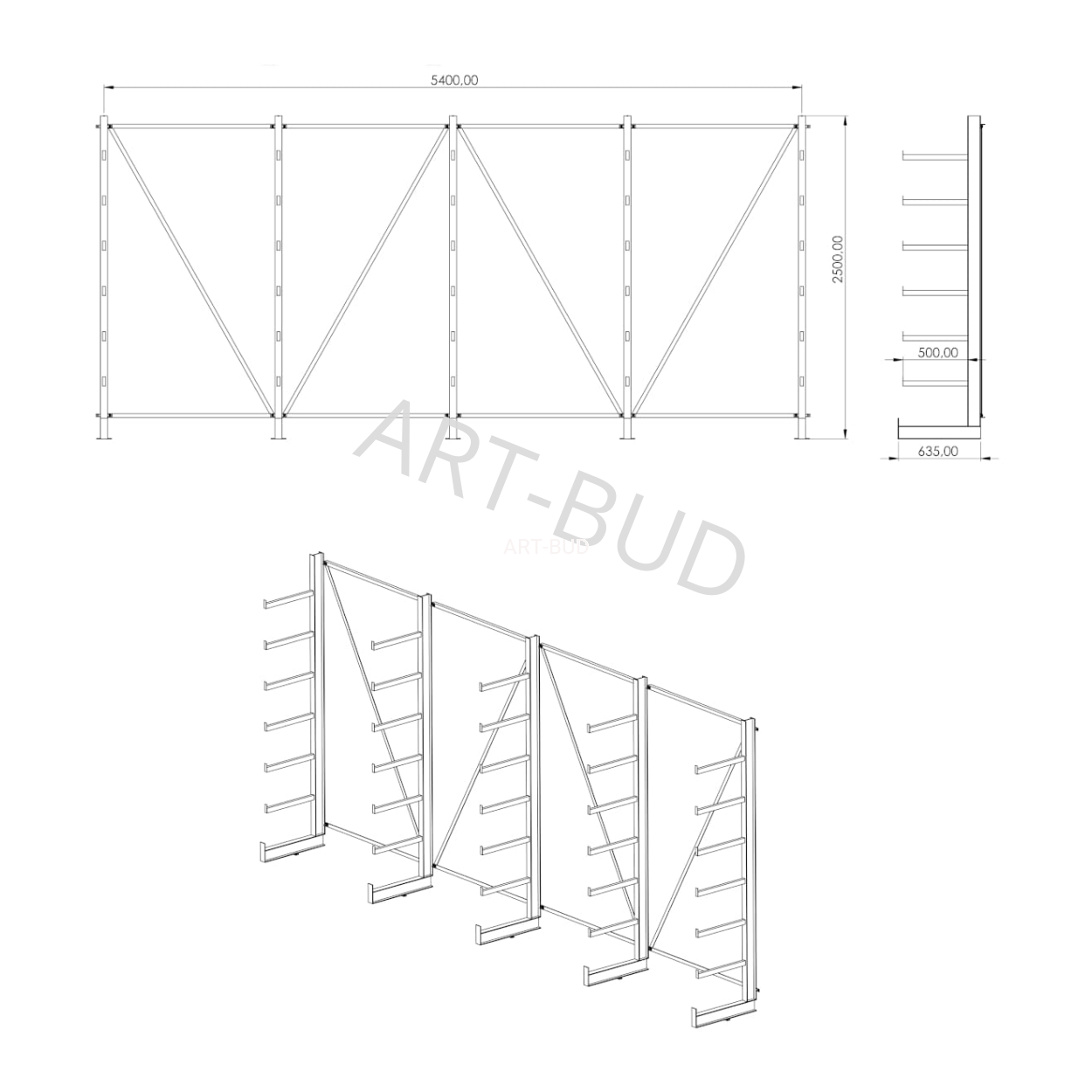 Spawany regał wspornikowy - równoramienny, jednostronny, 2500x5400x635mm