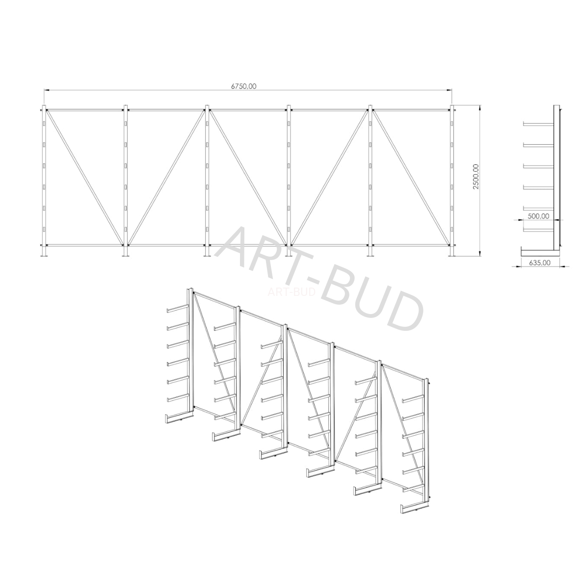 Spawany regał wspornikowy - równoramienny, jednostronny, 2500x6750x635mm