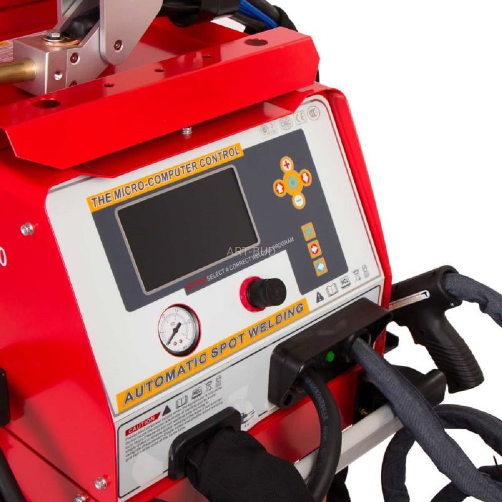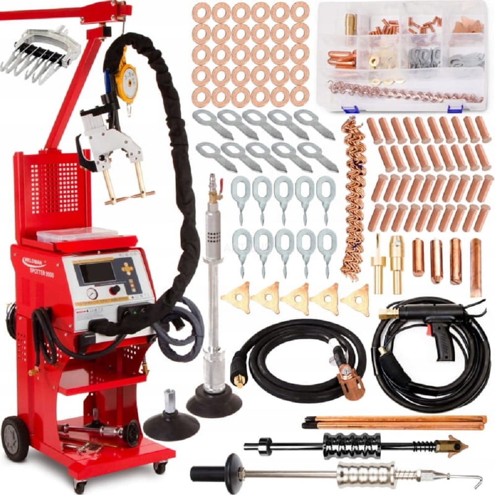 Model 9900 marki Weldman jest to profesjonalne urządzenie o najwyższych parametrach, posiada 10 trybów pracy oraz umożliwia zgrzewanie blach o grubości 4+4 mm. Maksymalny prąd zgrzewania 11000 A. Zasilanie 400V. Spotter z elektrodą miedzianą często wykorzystywany jest w warsztatach naprawczych jako zgrzewarka do blach. Pozwala to na rezygnację z innej technologii – z użyciem palnika gazowego. Warto również pamiętać, że brak konieczności użycia palnika gazowego zasilanego butlą wpływa na podniesienie bezpieczeństwa przebywających w warsztacie osób.