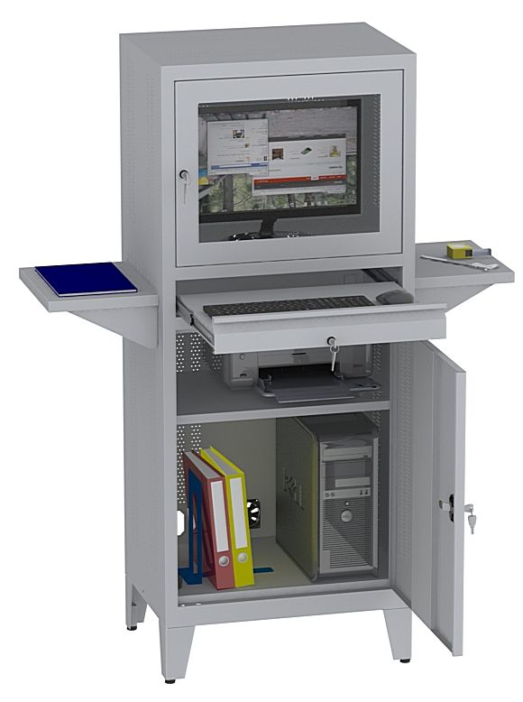 Opis: korpus szafy wykonany z blachy o grubości 0.7 mm, wysokość pulpitu wysuwanego od podłoża wynosi 1080mm, dodatkowy pulpit/półka PW400/3P, wisząca po obu stronach na wysokości 1080mm od podłoża, stanowisko znajduje się na nogach o wysokości 160mm