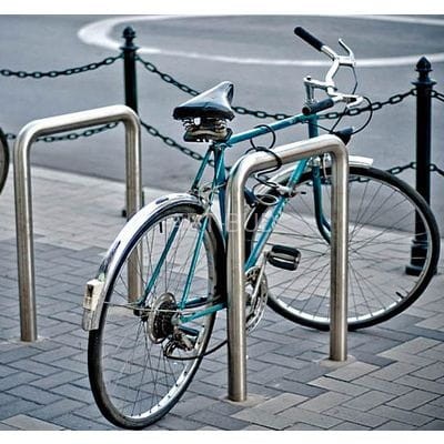 Stojak na rowery w kształcie U pozwala na przymocowanie zarówno ramy roweru jak i kół do stojaka.