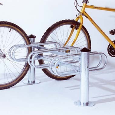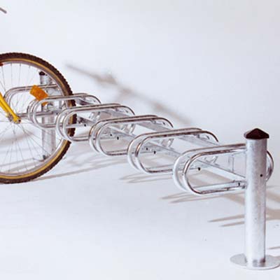 Bardzo trwałe stojaki, Jedno lub dwustronne. Na 3, 6, 12 lub więcej rowerów. Rurka galwanizowana, gałka odlana z aluminium, lakierowana, czarna. Przymocowane na płytach śrubami mocującymi. Stabilne ułożenie rowerów.