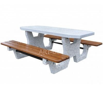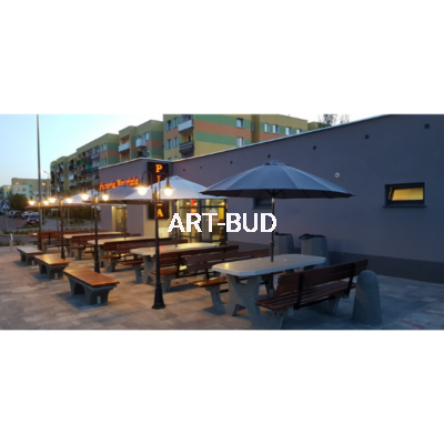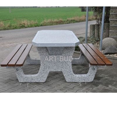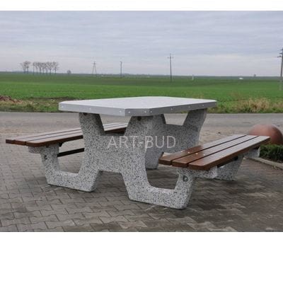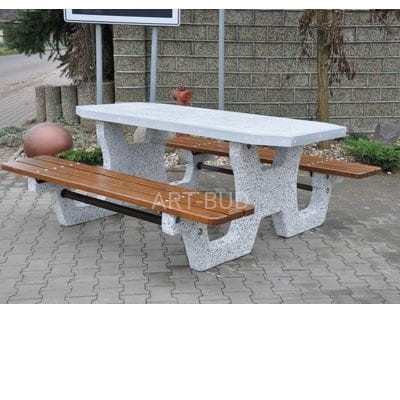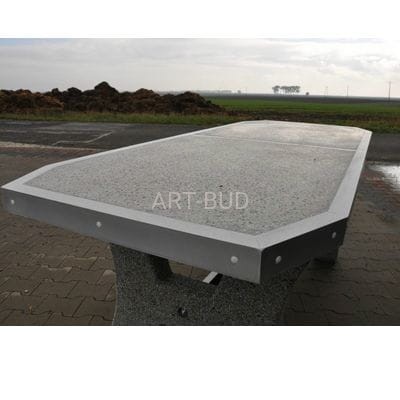 Blat wykonany z szlifowanego betonu, lakierowany specjalnym lakierem ochronnym, a stołu polerowane aluminium.
