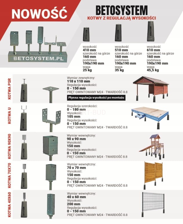 Gotowe kotwy betonowe z regulacją wysokości, to nowatorski system mocowania w gruncie wszelkich konstrukcji drewnianych i szkieletowych, głównie altan, wiat, szklarni i domków ogrodowych itp. System zapewnia solidne zamocowanie w gruncie, jednocześnie eliminując tradycyjne roboty betoniarskie i umożliwia bardzo precyzyjną regulację poziomu posadowienia konstrukcji. Kotwy betonowe oferowane są w trzech rozmiarach z jednym uniwersalnym systemem regulacji poziomej.