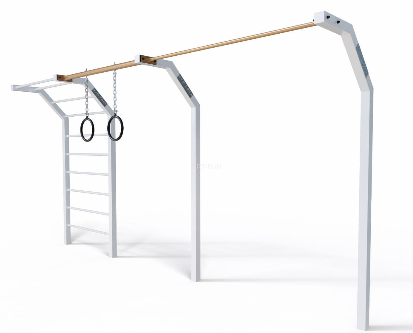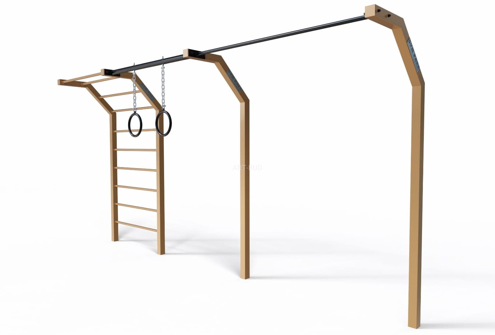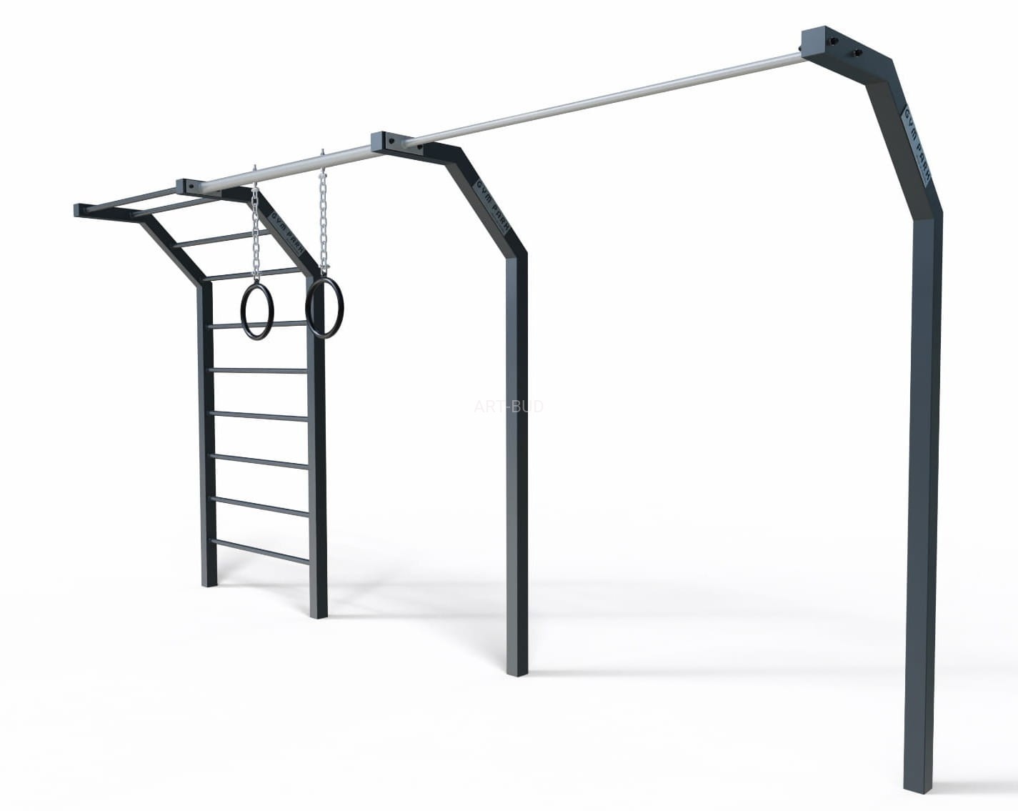 STREET WORKOUT Zestaw z drabinką pionową, wysięgnikiem, kółkami gimnastycznymi i szerokim drążkiem. Idealny do treningu kalistenicznego, rozwijającego siłę, wytrzymałość oraz koordynację ciała.