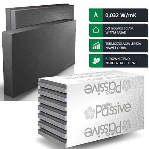 Ze względu na dużą powierzchnię przez ściany zewnętrzne budynku ucieka aż do 35% ciepła, dlatego niezmiernie ważne jest zarówno samo prawidłowe ocieplenie elewacji budynku, jak i wybór właściwego produktu do izolacji. Oferta dotyczy styropianu grafitowego (szary styropian PASSIVE) o obniżonym współczynniku przewodzenia ciepła (lambda nawet ≤ 0,031). Produkty te są szczególnie rekomendowane do budownictwa pasywnego i energooszczędnego. Warto przy tym rozważyć wykorzystanie produktów grafitowych, których zastosowanie umożliwia redukcję grubości ocieplenia nawet o 30%, dzięki czemu nie ograniczamy dopływu światła do pomieszczenia i poprawiamy estetykę budynku.