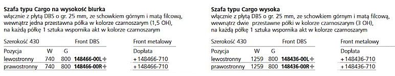 Podana cena podstawowa dotyczy szafy dwu półkowej o wysokości 740 mm symbol 148466-00L o wymiarach 740x800x430 mm z tabelki poniżej. Pozostałe modele na zapytanie.