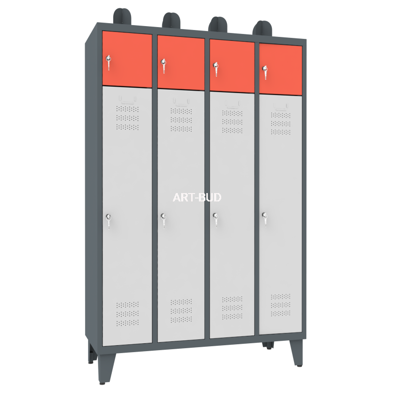 Solidna konstrukcja stalowa z wysokiej jakości blachy europejskich producentów, w podłodze otwory odprowadzające wodę, na szafie praktyczny uchwyt na hełm strażacki, nogi o wysokości 150 mm, w każdej komorze drążek i zawieszki na ubrania, łatwość utrzymania czystości dzięki gładkiej, jednolitej powierzchni. Model przeznaczony jest dla czterech użytkowników, posiada dodatkową skrytkę zamykaną kluczykiem.