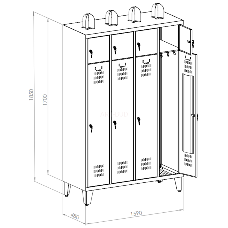 Szafy w standardzie mają zamykany tylko skarbczyk (zamek cylindryczny). Komora z drążkiem i haczykami jest otwarta. Posiadają perforowaną podłogę, nogi 150 mm *uchwyt na hełm +150 mm.