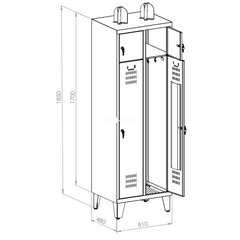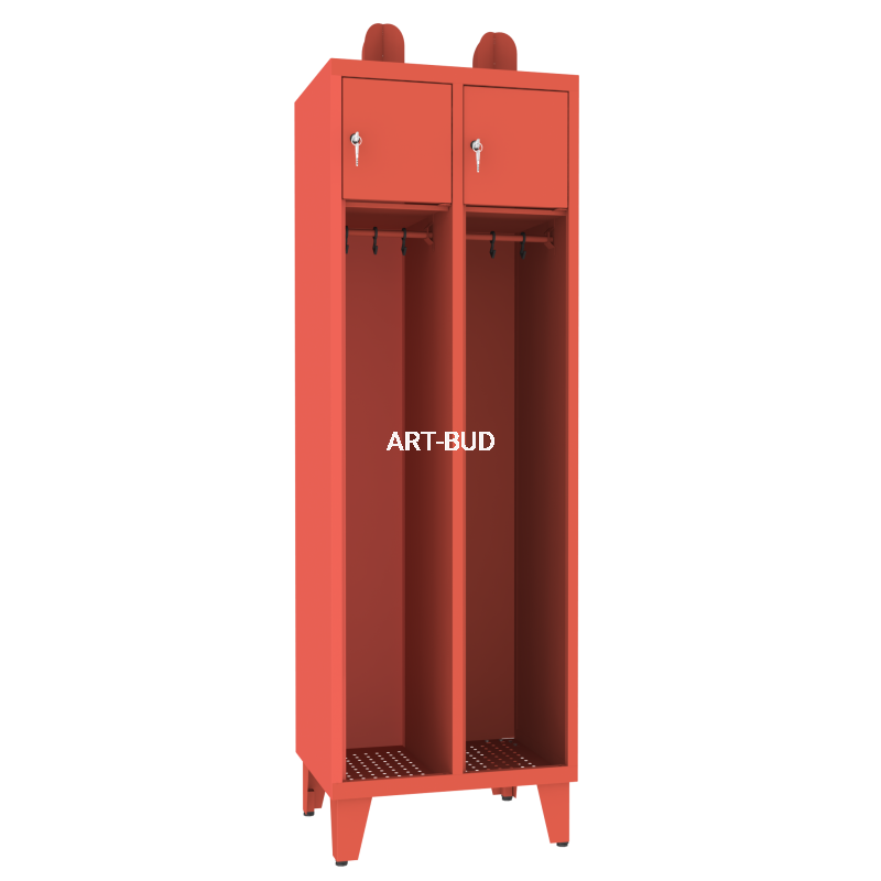 solidna konstrukcja stalowa z wysokiej jakości blachy europejskich producentów, w podłodze otwory odprowadzające wodę, na szafie praktyczny uchwyt na hełm strażacki, nogi o wysokości 150 mm, w każdej komorze drążek i zawieszki na ubrania, łatwość utrzymania czystości dzięki gładkiej, jednolitej powierzchni. Model przeznaczony jest dla dwóch użytkowników, posiada dodatkową skrytkę zamykaną kluczykiem.