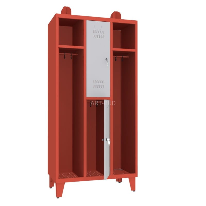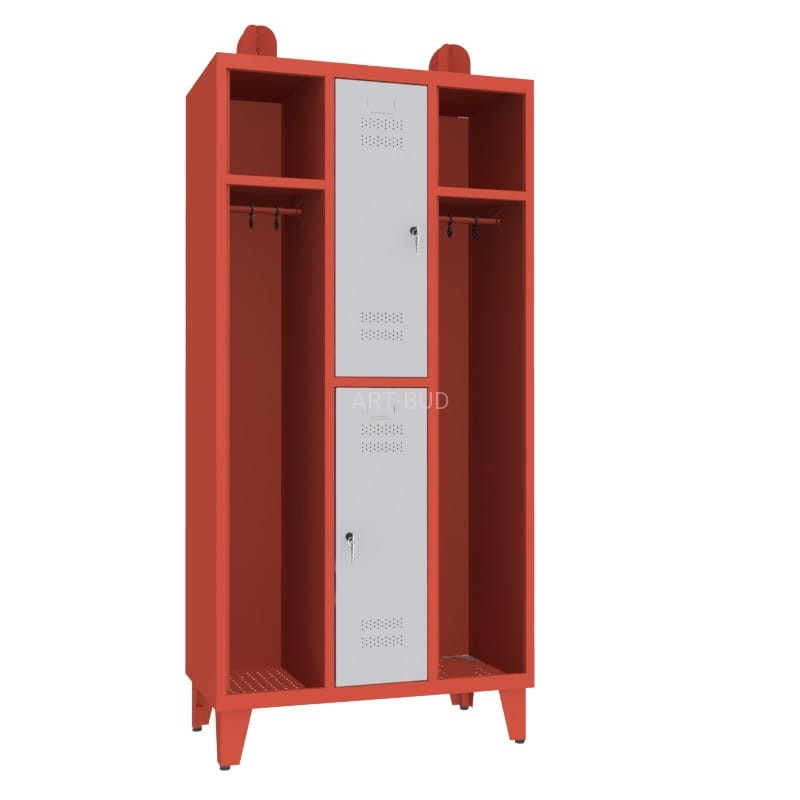 Najwyższej jakości metalowa szafa strażacka dla dwóch osób. Zawiera dwie wnęki odkryte do wieszania odzieży oraz dwie szafki zamykane na drobne akcesoria i rzeczy osobiste.