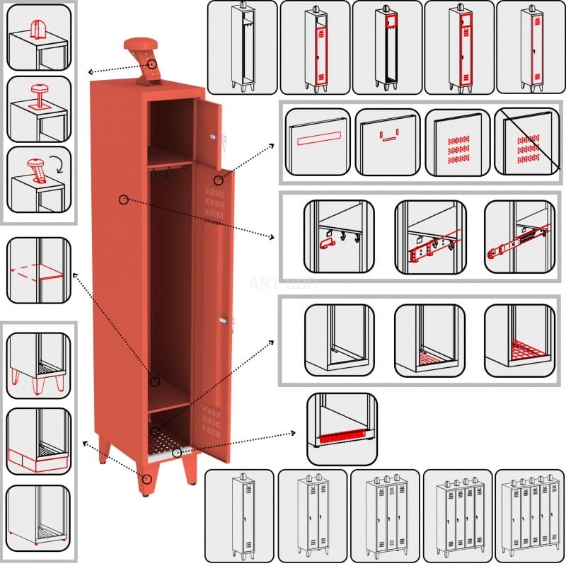 Szafy w standardzie mają zamykany tylko skarbczyk (zamek cylindryczny). Komora z drążkiem i haczykami jest otwarta. Posiadają perforowaną podłogę,nogi 150 mm *uchwyt na hełm +150 mm.