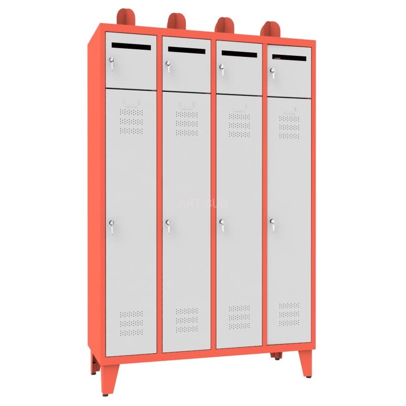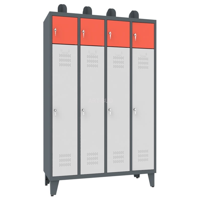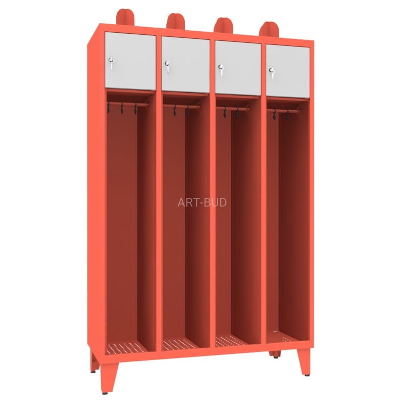 Najwyższej jakości metalowa szafa strażacka dla czterech osób. Zawiera dużą szafkę do wieszania odzieży oraz szafkę zamykaną na drobne akcesoria i rzeczy osobiste.
