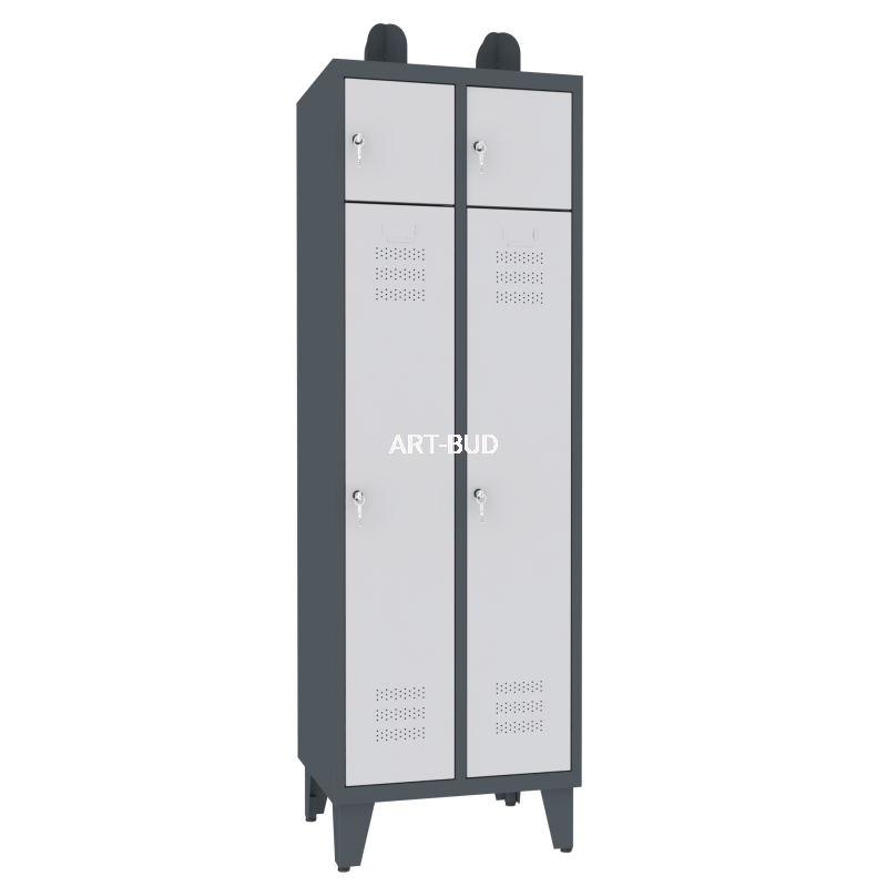 solidna konstrukcja stalowa z wysokiej jakości blachy europejskich producentów, w podłodze otwory odprowadzające wodę, na szafie praktyczny uchwyt na hełm strażacki, nogi o wysokości 150 mm, w każdej komorze drążek i zawieszki na ubrania, łatwość utrzymania czystości dzięki gładkiej, jednolitej powierzchni. Model przeznaczony jest dla dwu użytkowników, posiada dodatkową skrytkę zamykaną kluczykiem.