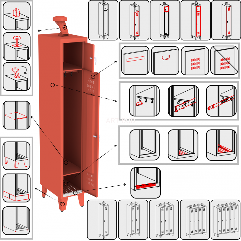 Szafy w standardzie mają tylko zamykany skarbczyk (zamek cylindryczny). Komora z drążkiem i haczykami jest otwarta. Posiadają perforowaną podłogę, nogi 150 mm*uchwyt na hełm +150 mm