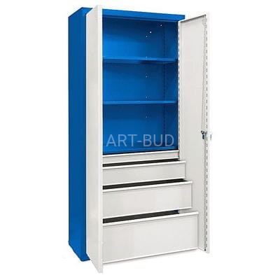 Najwyższej jakości stalowa szafa uniwersalna, półkowo-szufladowa o konstrukcji zgrzewanej, zamykana na zamek, do uniwersalnych zastosowań, dedykowana głównie do przechowywania akt, map, planów itp.