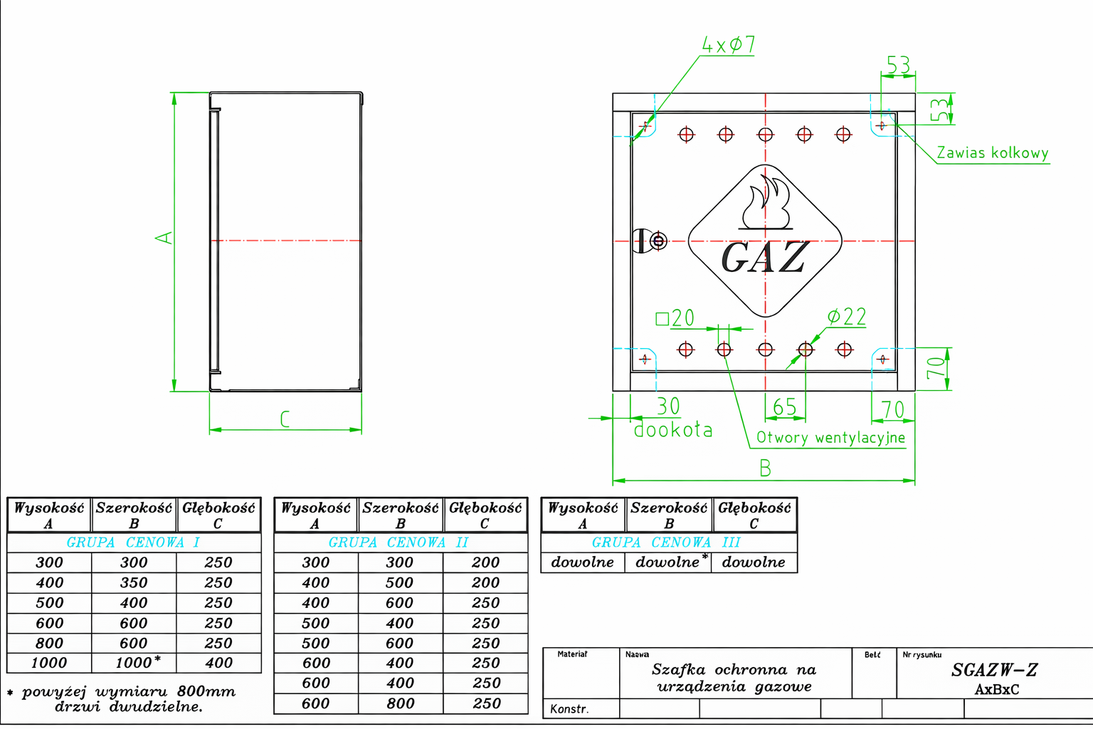 Drzwi: pełne + otwory wentylacyjne + oznakowanie "GAZ" z płomieniem