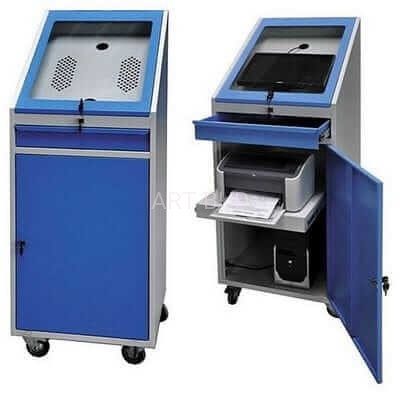 Górna przeszklona część pozwala na umieszczenie monitora LCD o rozmiarach do 23". Wykonana została z wytrzymałego szkła. Umożliwia ona korzystanie ze sprzętu nawet w warunkach występowania kurzu i pyłu na hali produkcyjnej oraz chroni komputer przed wstrząsami. Dolna część służy do bezpiecznego przechowywania jednostki PC oraz innych urządzeń towarzyszących. Znajduje się w niej półka przesuwna co 25 mm. Szafka pod komputer przemysłowy wyposażona została również w szufladę na klawiaturę. Te trzy wydzielone części otwierane są oddzielnie i każda jest zamykana na oddzielny zamek. Szafka pod komputer przemysłowy posiada nóżki z możliwością poziomowania, co pozwala ustawić ją na każdej, nawet nierównej podłodze. Szafka SMK 3a na bocznych ścianach posiada otwory wentylacyjne.