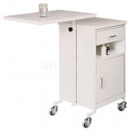 Przyłóżkowa szafka medyczna 201 wyposażona została w szufladę, w drzwiach szafki uchwyt i zatrzask magnetyczny. Szafka przyłóżkowa z regulowanym blatem – szuflada i szafka otwierają się z obu stron. Blaty posiadają powłokę melaminową w kolorze białym. Kółka umożliwiają łatwe przemieszczanie szafki, a blokada dwóch z nich