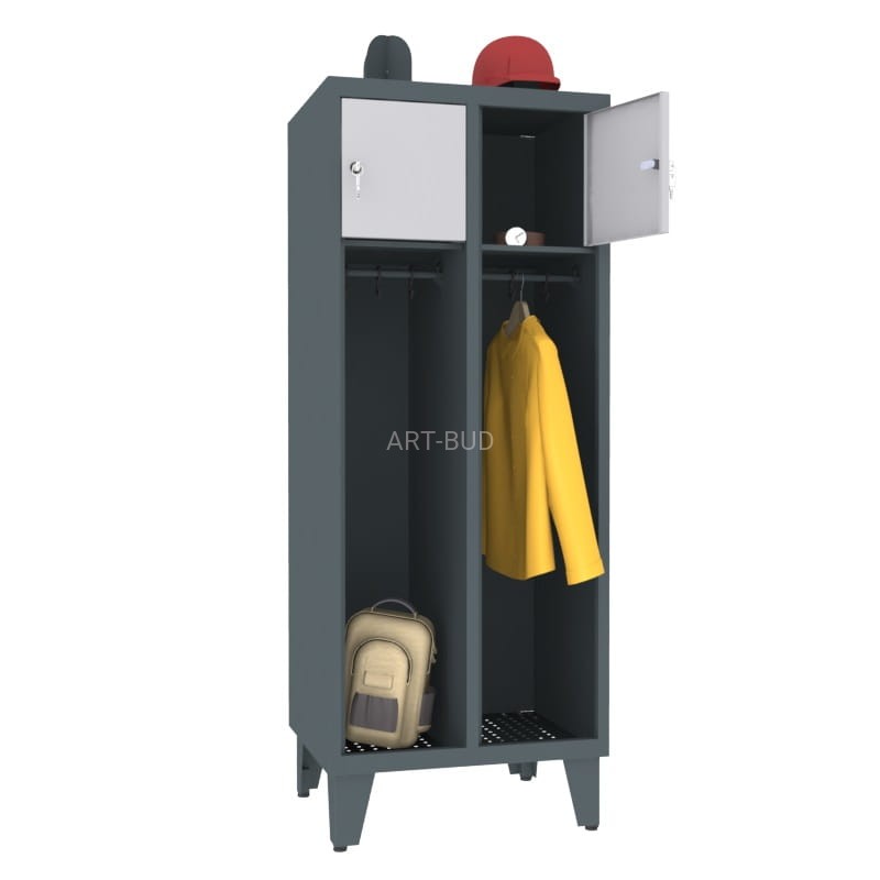 Najwyższej jakości metalowa szafa strażacka dla dwu osób. Zawiera dwie duże wnęki do wieszania odzieży oraz szafki zamykane na drobne akcesoria i rzeczy osobiste.