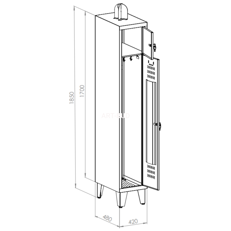 Szafy w standardzie mają zamykany tylko skarbczyk (zamek cylindryczny). Komora z drążkiem i haczykami jest otwarta. Posiadają perforowaną podłogę, nogi 150 mm *uchwyt na hełm +150 mm.