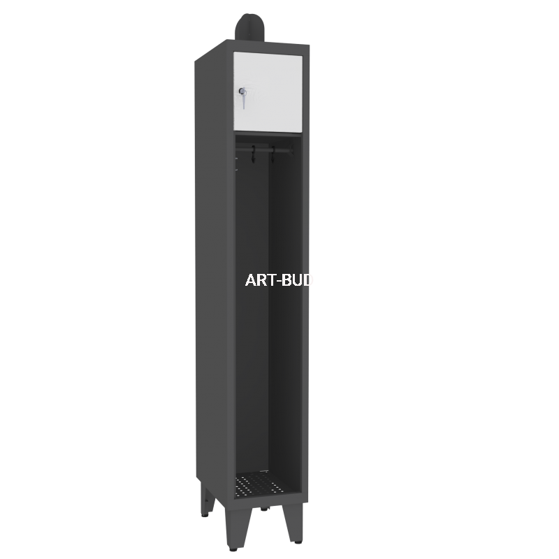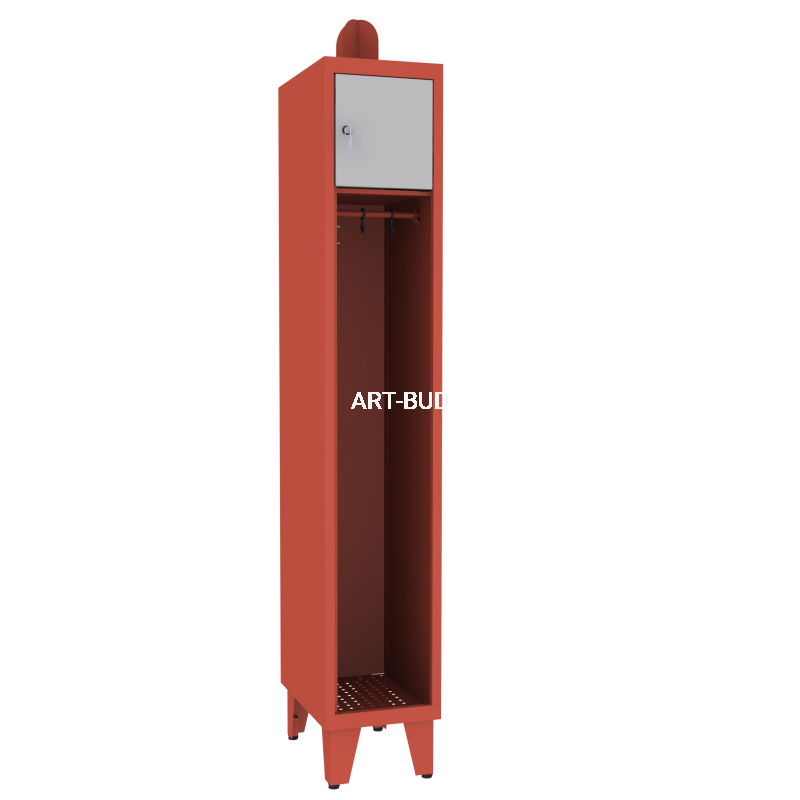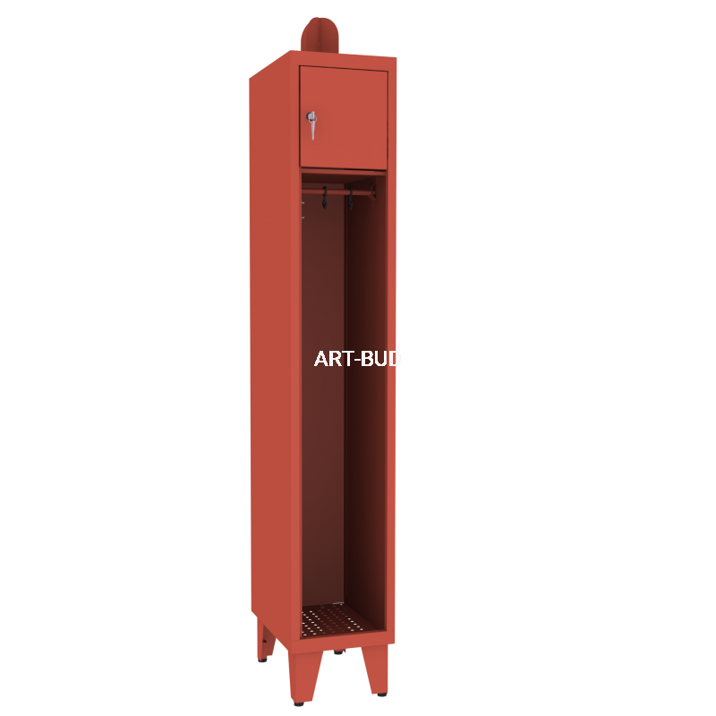 Najwyższej jakości metalowa szafa strażacka dla jednej osoby. Zawiera dużą wnękę do wieszania odzieży oraz szafkę zamykaną na drobne akcesoria i rzeczy osobiste.