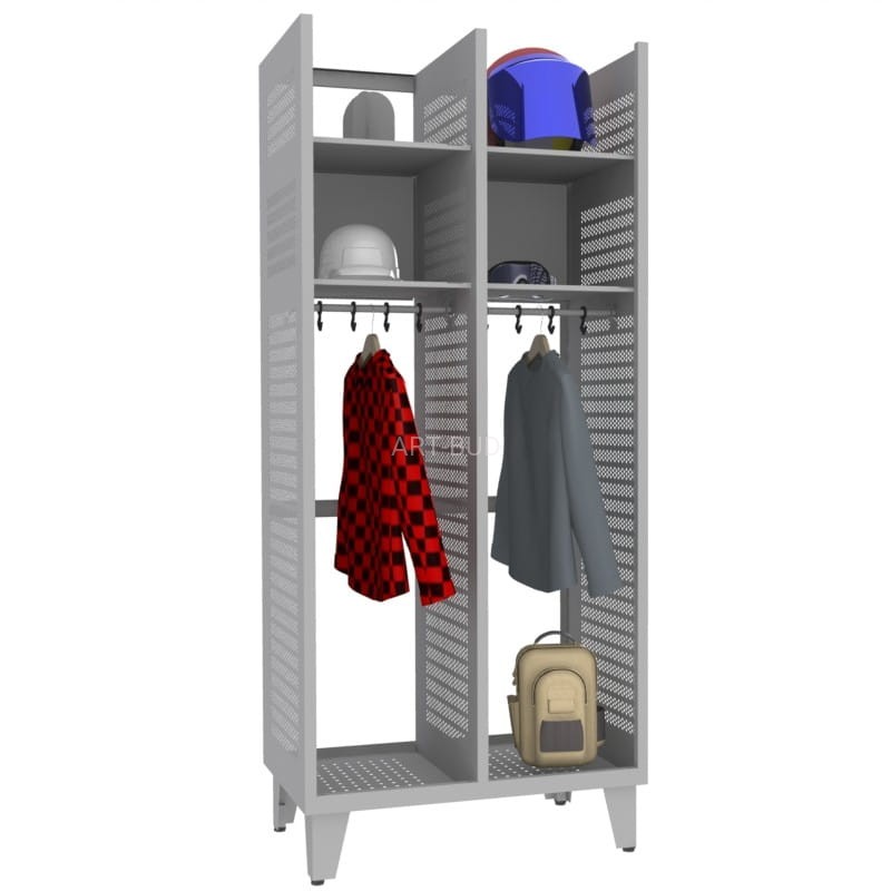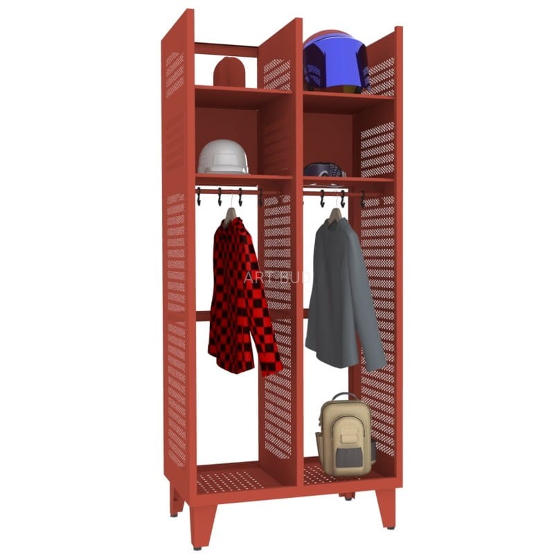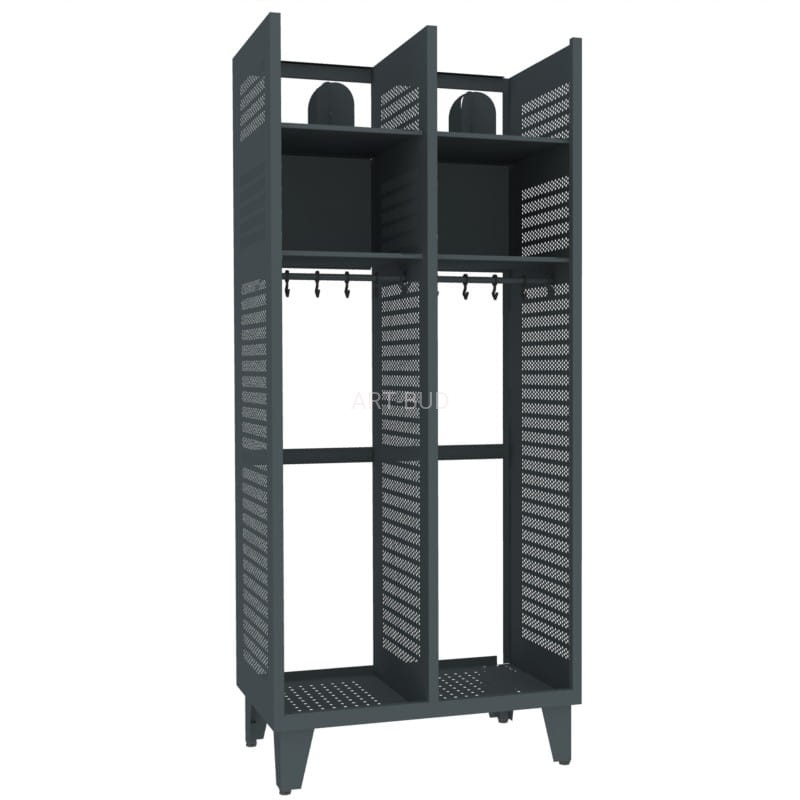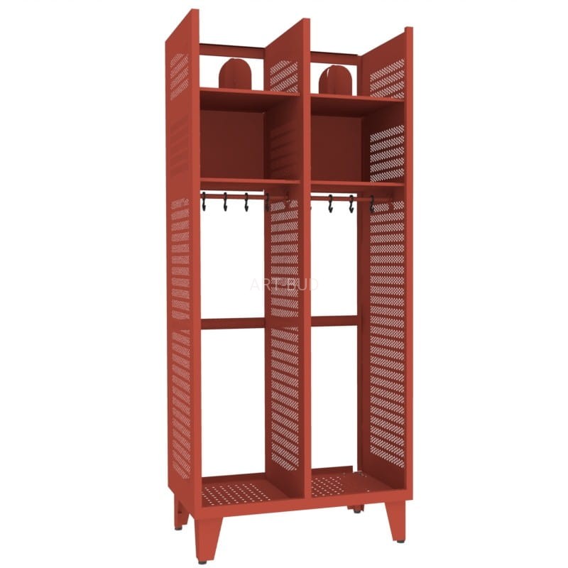 Najwyższej jakości metalowa szafa strażacka dwuosobowa bez drzwi. Zawiera dwie wnęki o bocznych ścianach perforowanych do wieszania odzieży oraz półki na drobne akcesoria i rzeczy osobiste.