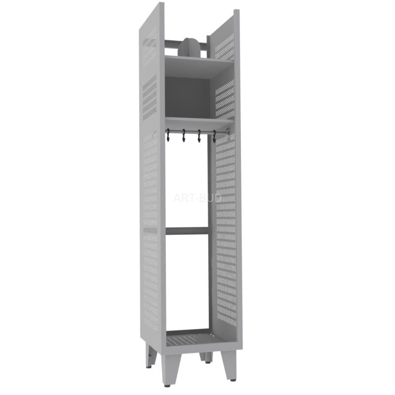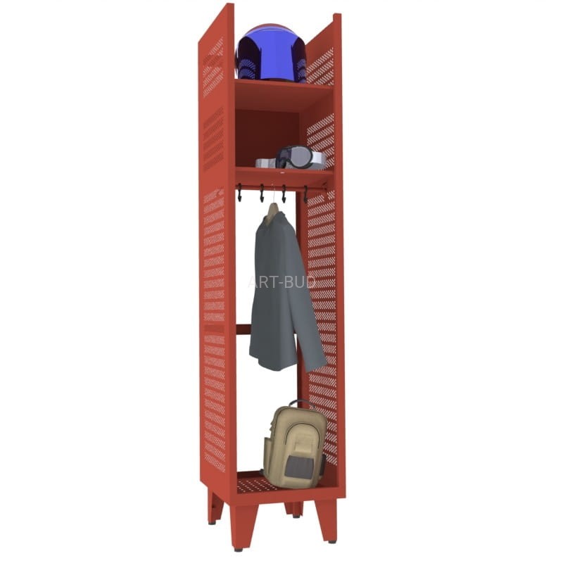 Najwyższej jakości metalowa szafa strażacka jednoosobowa bez drzwi. Zawiera dużą wnękę o bocznych ścianach perforowanych do wieszania odzieży oraz półki na drobne akcesoria i rzeczy osobiste.