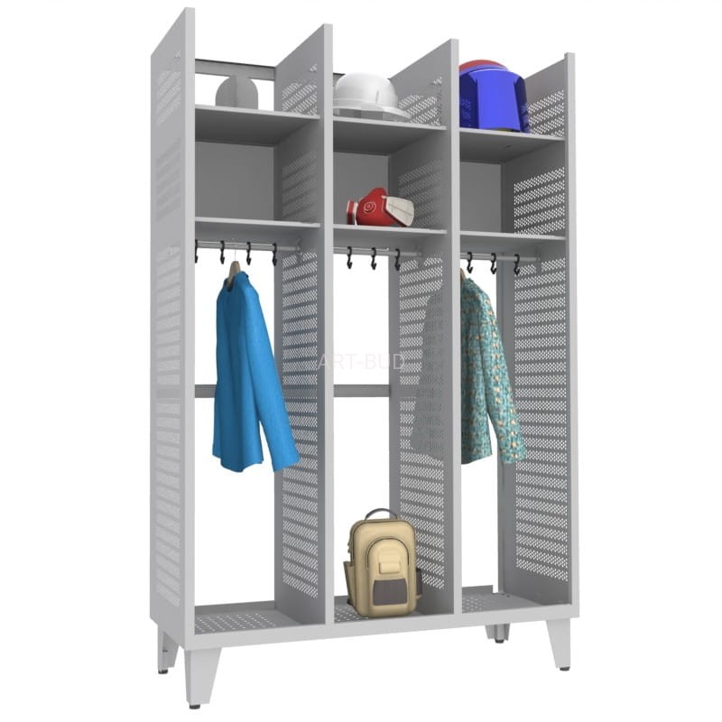 Najwyższej jakości metalowa szafa strażacka trzyosobowa bez drzwi. Zawiera trzy wnęki o bocznych ścianach perforowanych do wieszania odzieży oraz półki na drobne akcesoria i rzeczy osobiste.