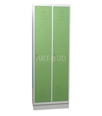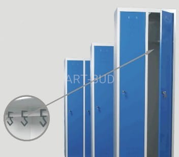 W każdej komorze półka i drążek z przesuwanymi wieszakami, drzwi wyposażone w otwory wentylacyjne, zamykane zamkiem cylindrycznym z dwoma kluczykami, drzwi z profilem wzmacniającym, osadzone na ukrytych zawiasach,